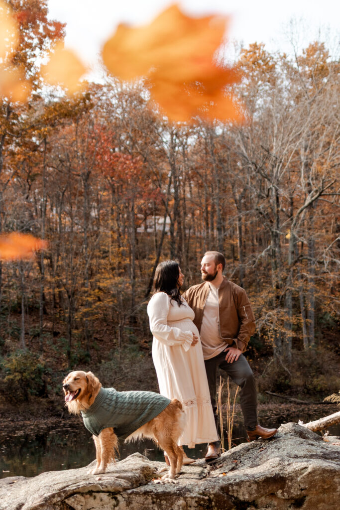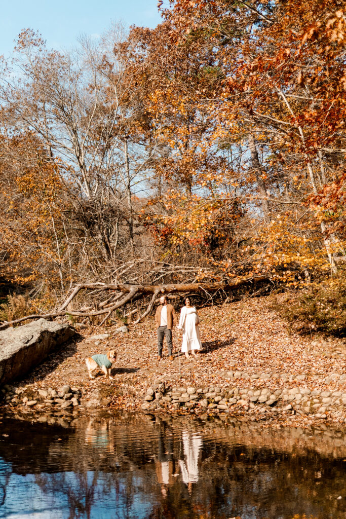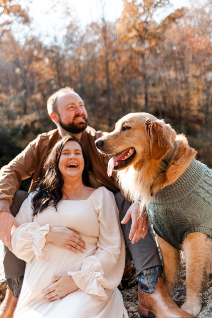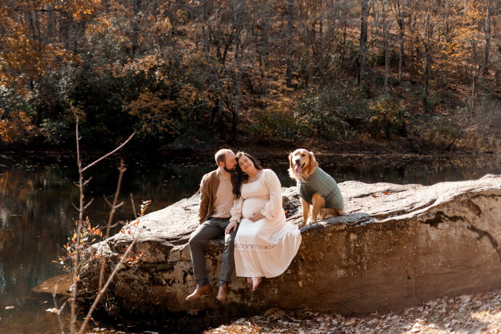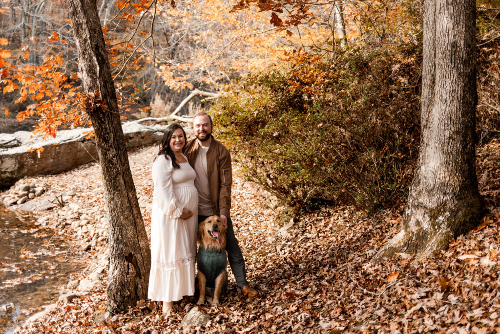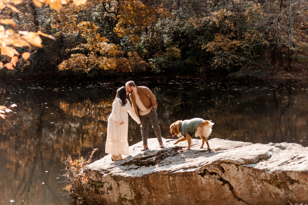 I met the couple at their vacation rental in Mentone, Alabama, a cozy spot called The Shire. Cue the excitement! The riverside property definitely lived up to its name, offering plenty of space for us to roam and wander. Nicole’s flowy white dress was the perfect choice against the backdrop of colorful fall foliage, and Tuddy even dressed the part in an adorable little sweater! There were good vibes all around as I documented the couple and their pup frolicking in the leaves and cuddling up by the water.