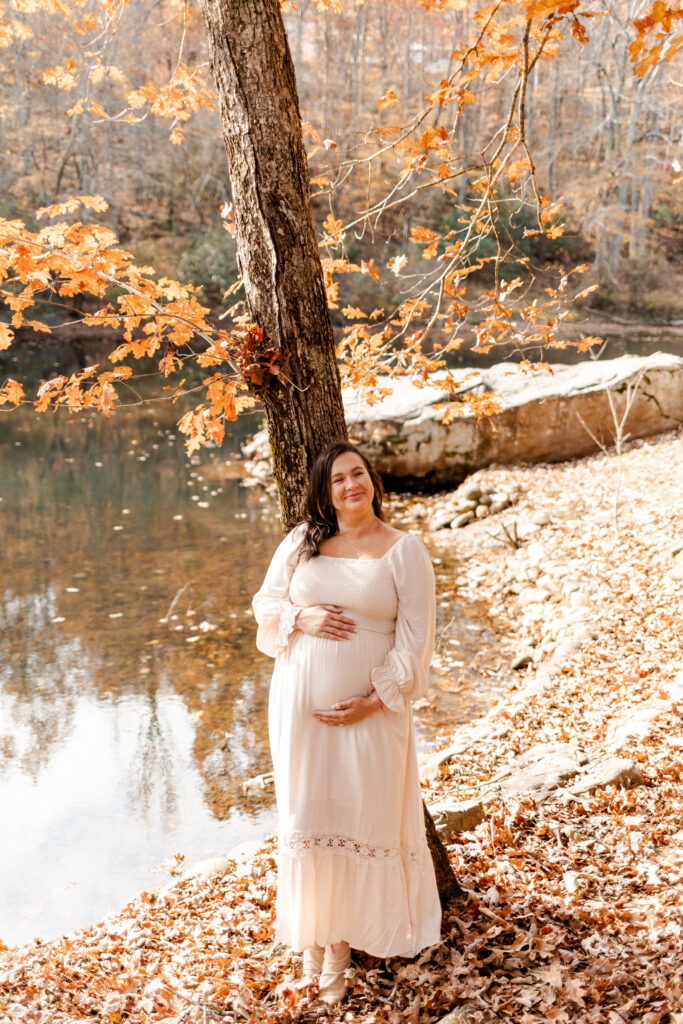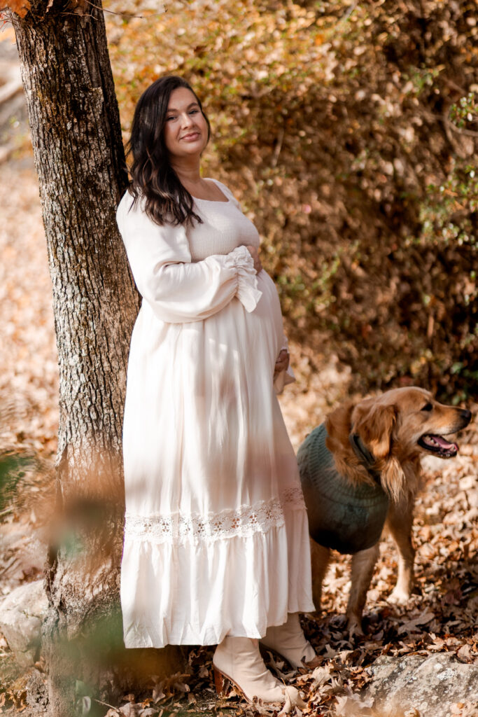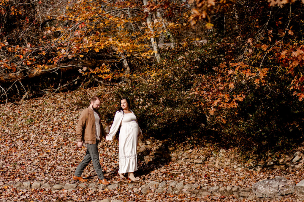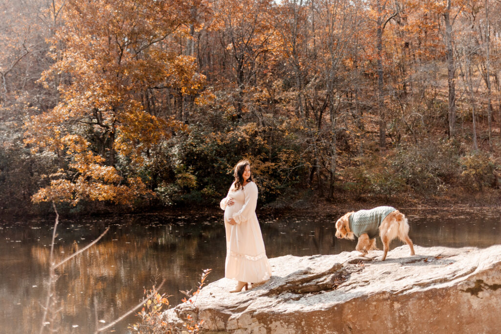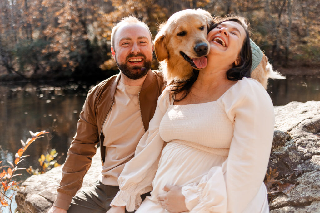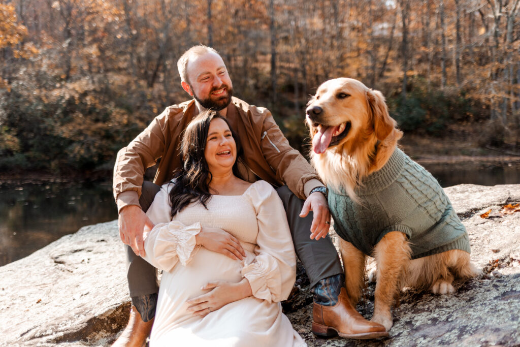 I met the couple at their vacation rental in Mentone, Alabama, a cozy spot called The Shire. Cue the excitement! The riverside property definitely lived up to its name, offering plenty of space for us to roam and wander. Nicole’s flowy white dress was the perfect choice against the backdrop of colorful fall foliage, and Tuddy even dressed the part in an adorable little sweater! There were good vibes all around as I documented the couple and their pup frolicking in the leaves and cuddling up by the water.