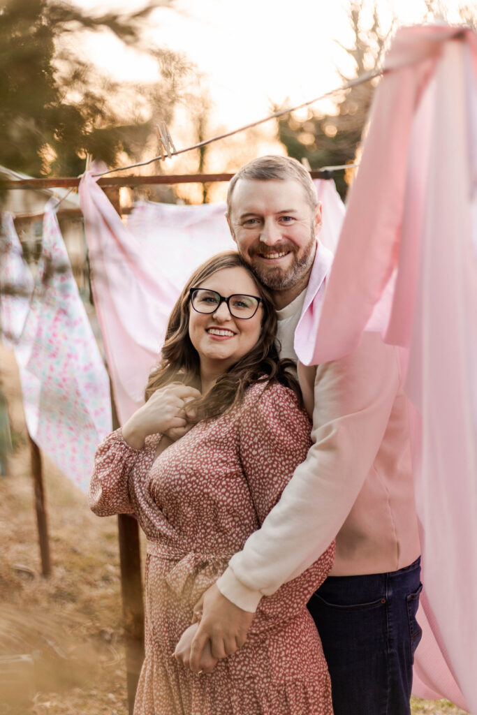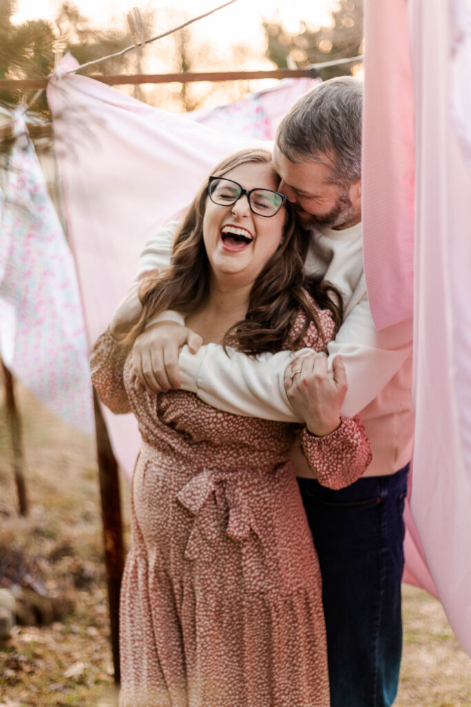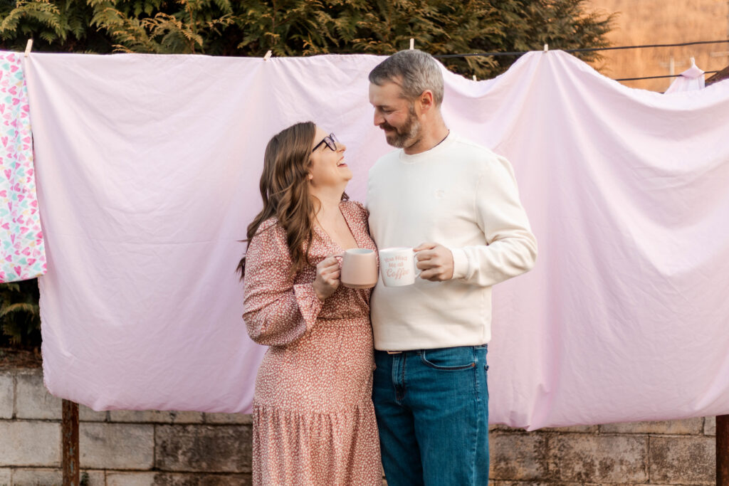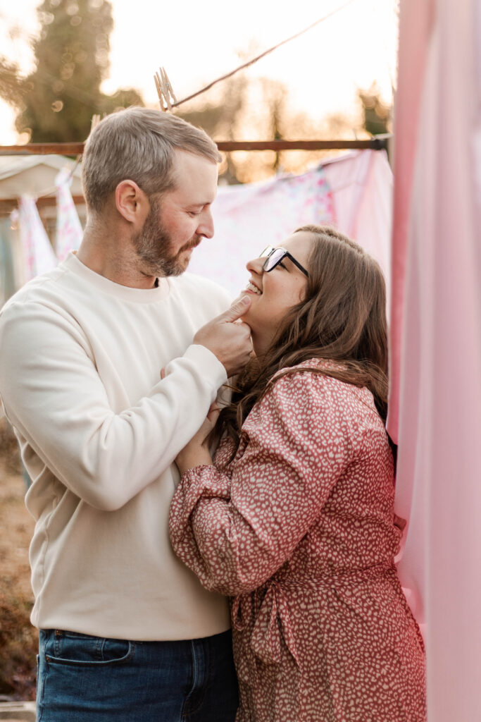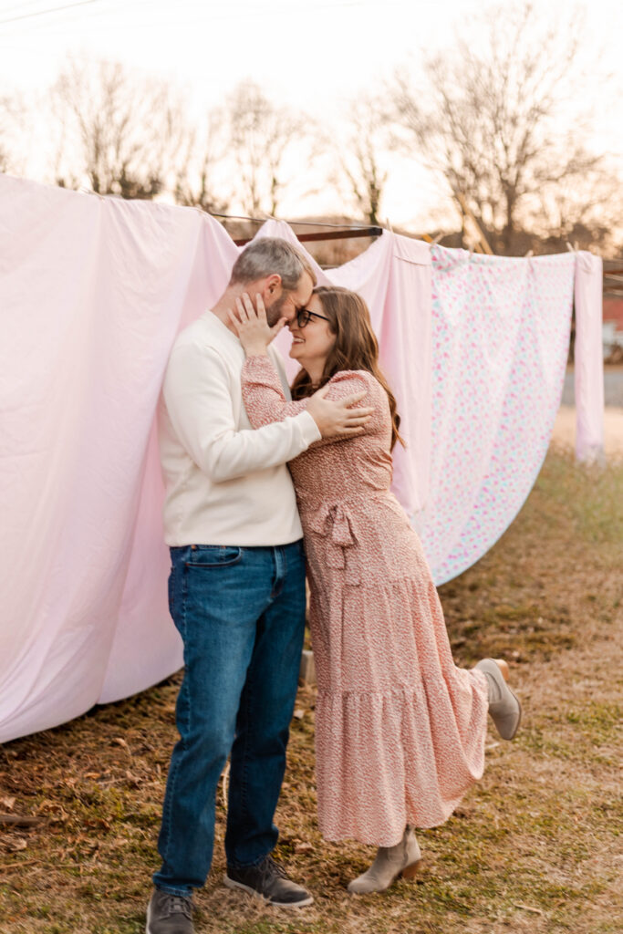 It wasn’t hard at all to capture cute candids of Ally and Derrick, but I also led them through some of my go-to couple poses for engagement photos to really make sure we got the shot. Derrick makes Ally giggle like no other, and you can tell within minutes of meeting them that their relationship is the real deal. From frolicking through the hanging sheets to sharing cups of coffee and stealing kisses in front of the rustic barn, I loved every minute of this Fort Payne Farmhouse Engagement Session.