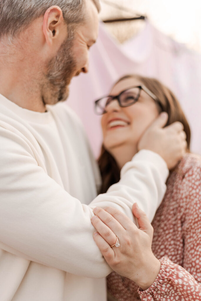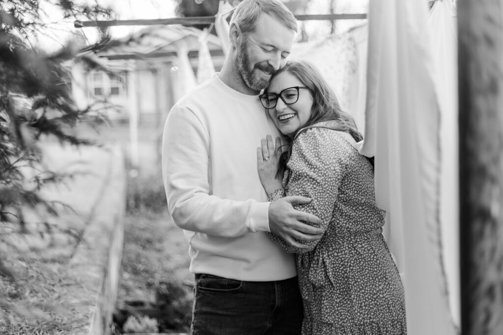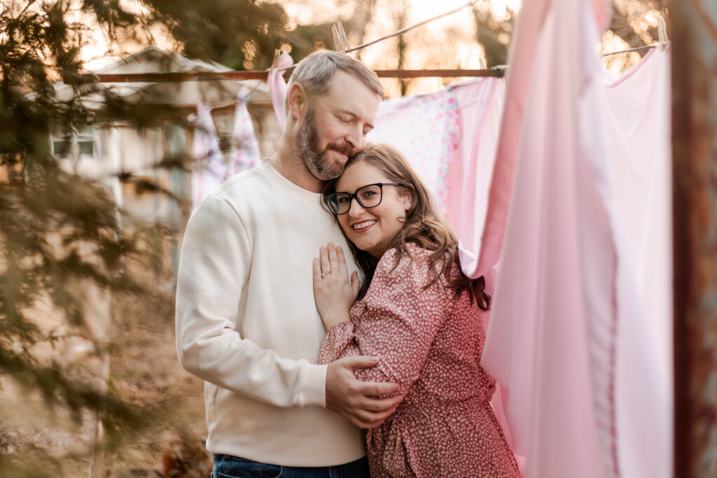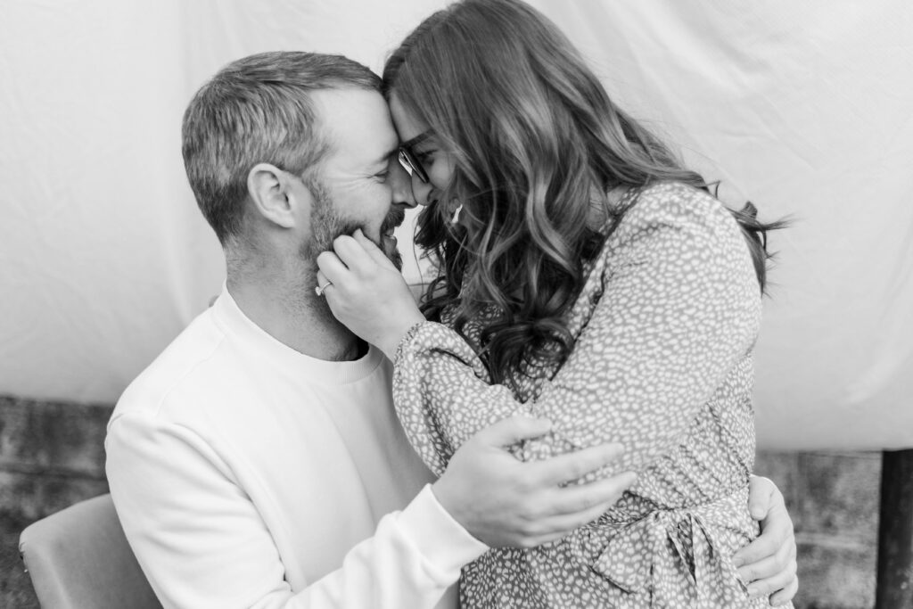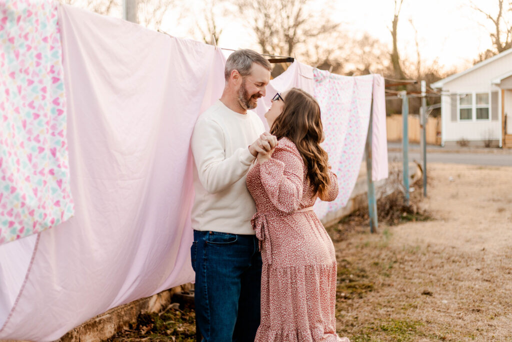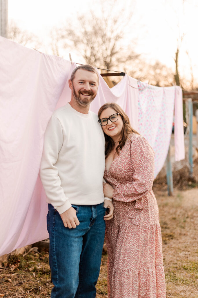 It wasn’t hard at all to capture cute candids of Ally and Derrick, but I also led them through some of my go-to couple poses for engagement photos to really make sure we got the shot. Derrick makes Ally giggle like no other, and you can tell within minutes of meeting them that their relationship is the real deal. From frolicking through the hanging sheets to sharing cups of coffee and stealing kisses in front of the rustic barn, I loved every minute of this Fort Payne Farmhouse Engagement Session.